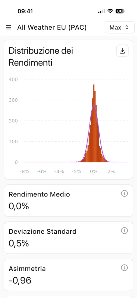 La distribuzione dei rendimenti aiuta a capire come si comporta il portafoglio nel tempo. Oltre alla media, Wallible calcola indicatori di asimmetria (skewness) e curtosi (kurtosis), che descrivono la forma della distribuzione e la presenza di code estreme. Insieme al Value at Risk (VaR), questa analisi permette di valutare la probabilità di perdite significative e di confrontare portafogli con profili di rischio diversi.