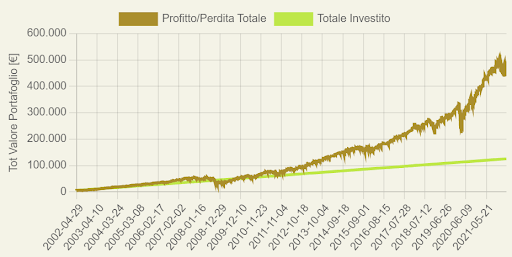 Vediamo che sul lungo periodo l’elevato rischio, quantificabile con una volatilità del 19.7% del portafoglio, abbia restituito un notevole profitto di circa il 250% (11.5% annualizzato). A fronte quindi di un investimento accumulato di 125k€ il valore attuale si trova a circa mezzo milione. Sul lungo periodo è visibile anche l’effetto benefico dell’interesse composto, parte destra del grafico dove si vede un esponenziale distacco della curva valore portafoglio (marrone) e capitale investito (verde). Notiamo anche come il massimo drawdown durante la crisi sub-prime sia pari a -46%.