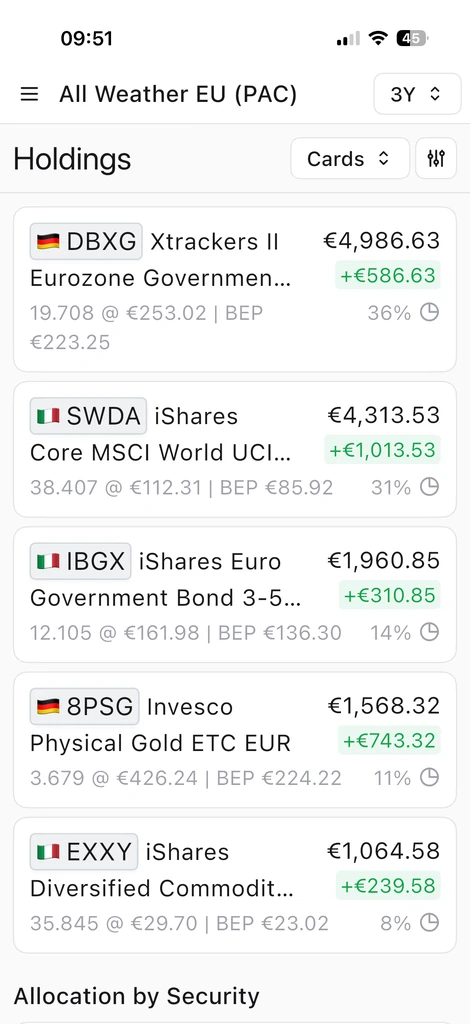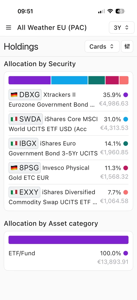 Diese Ansicht ist wie ein Foto der Portfoliostruktur zu einem bestimmten Zeitpunkt. In einem Portfolio von 100.000 EUR könnten beispielsweise Positionen wie „Global“ erscheinen. Das Gewicht jeder Position zeigt, wie stark diese einzelne Anlage das Gesamtergebnis beeinflusst – hilfreich zur Bewertung der Risikokonzentration.