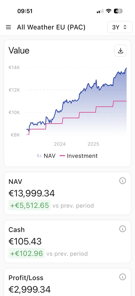 Beispiel: Angenommen, du hast insgesamt 100.000 EUR investiert. Wenn das Portfolio heute 120.000 EUR wert ist, bedeutet das einen nicht realisierten Gewinn von 20.000 EUR (nach Steuern und Kosten). Ist das Portfolio weniger wert als das investierte Kapital, spiegelt es einen potenziellen Verlust wider. Diese Werte über die Zeit zu verfolgen ist ebenso wichtig: Ein Zeitdiagramm, das den NAV Tag für Tag (oder Monat für Monat) zeigt, macht sichtbar, wie dein Vermögen wächst und wann das Portfolio an Wert gewonnen oder verloren hat.