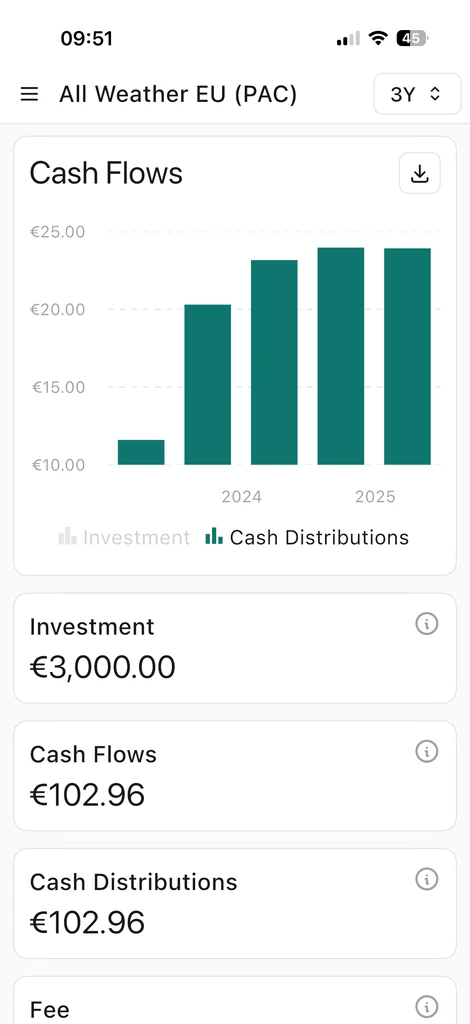 Der Bereich Cash Flows bietet eine detaillierte Ansicht aller Geldbewegungen in und aus dem Portfolio. Hier werden Einzahlungen (Kapitalzuflüsse), Ausschüttungen (Auszahlungen) und verschiedene bezahlte Kosten chronologisch erfasst. Praktisch ist es wie ein Kontoauszug des Investmentportfolios.