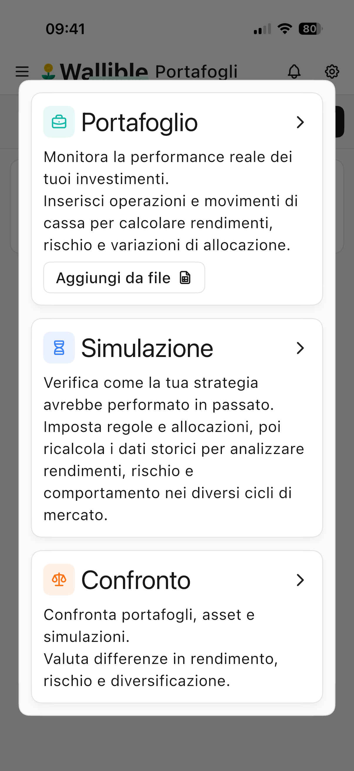 Trovi il simulatore e molti altri strumenti di analisi finanziaria nella piattaforma di Wallible. Visualizzare le strategie di investimento è semplice e ti aiuta a prendere decisioni consapevoli sui tuoi risparmi. La registrazione è gratuita e ti dà accesso a una vasta gamma di strumenti.