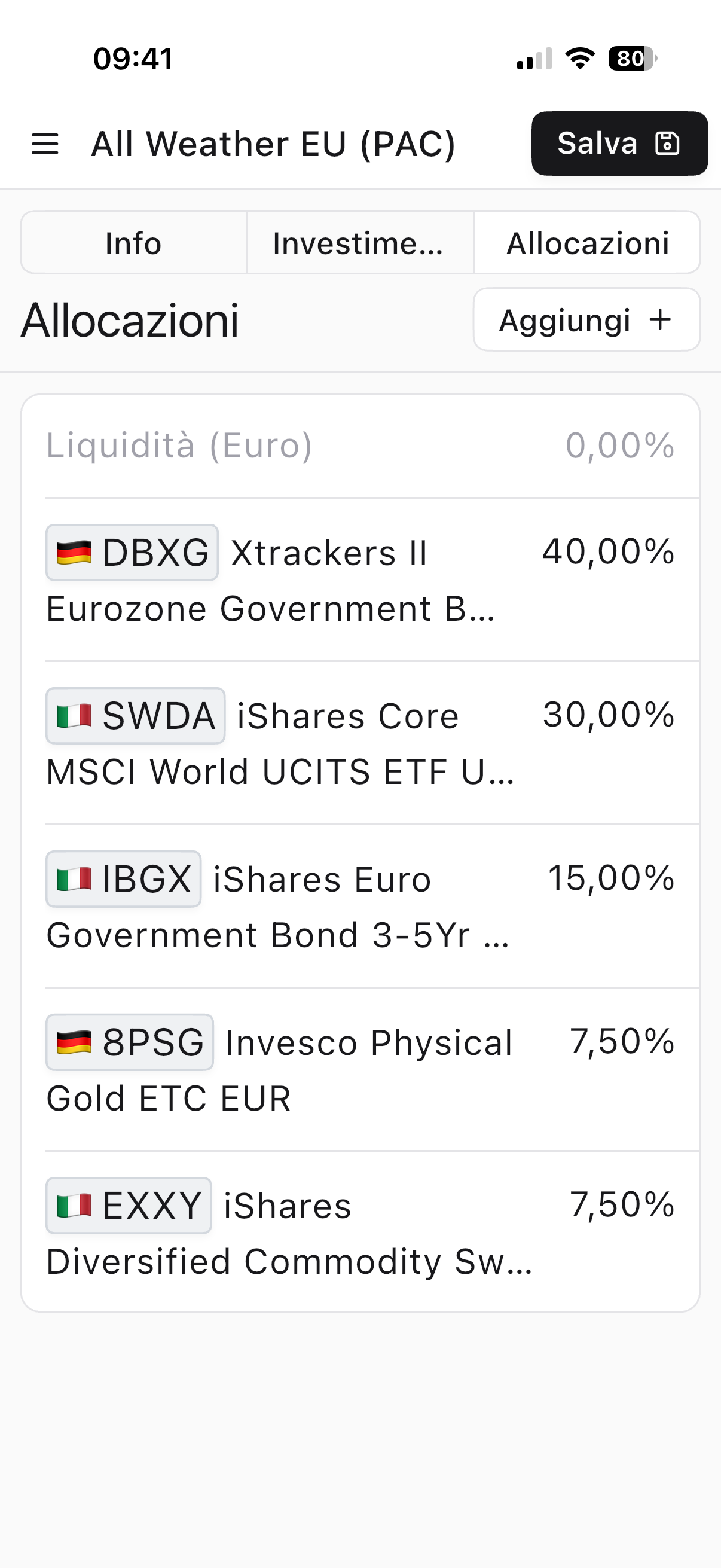 - Se le allocazioni sommano a <100%, il residuo resta in cassa a rendimento lordo 0%.