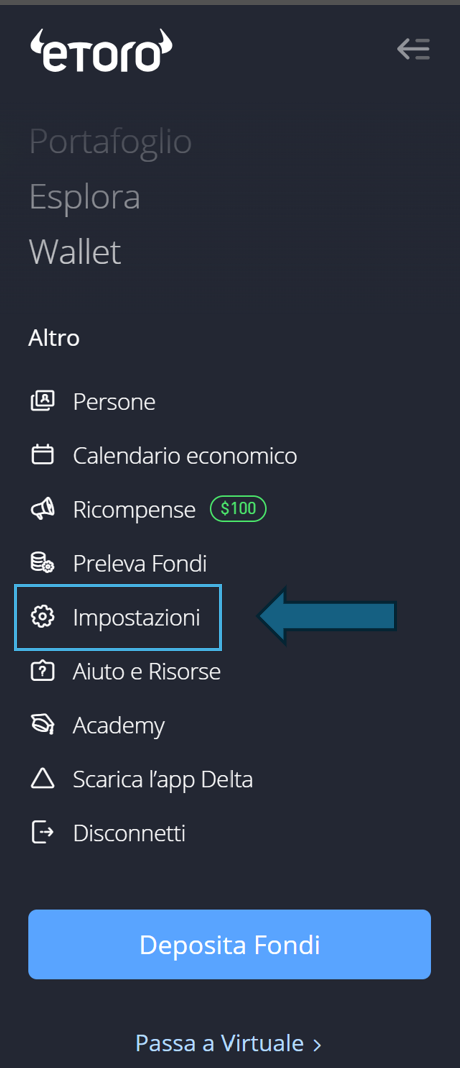 Per ottenere il file da caricare su Wallible, scarica il report XLS dal portale eToro. Segui questi passaggi: