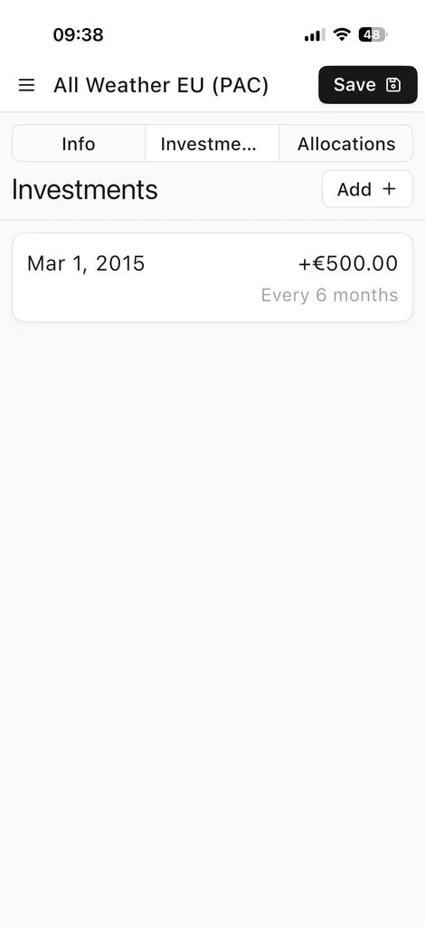 El simulador te permite probar estrategias antes de usarlas realmente: defines flujos de caja, frecuencias de compra y asignaciones, y Wallible calcula la trayectoria simulada (NAV, rendimientos, riesgo, diversificación, etc.). Para conocer todas las métricas disponibles, consulta la Guía de métricas de Wallible.