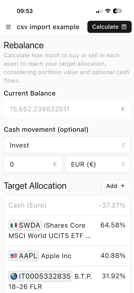 En Wallible tienes la posibilidad de calcular las transacciones de compra/venta que deben realizarse para cada título del portafolio en función de la asignación de activos deseada. Esto te permite pasar rápidamente del análisis a la práctica, con indicaciones claras sobre cómo realinear tus portafolios monitoreados.